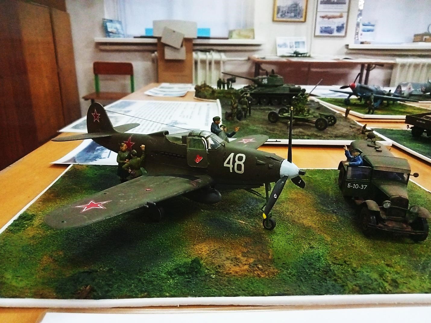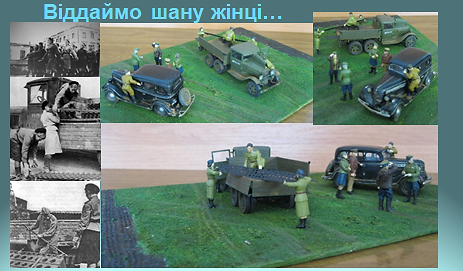Інший важливий момент полягав у тому, щоб при наявних засобах відтворити реальну картинку на основі фотодокументів. Що тут було важливо? Знову певні «дрібнички», ось як така. Важкі винищувачі ВПС Армії США Р-38 потребували спеціальних злітно-посадочних смуг, як і бомбарувальники. На аеродромах полтавського авіаційного вузла це були металеві злітні смуги, створені із спеціальних металевих секцій. Точно так, як на аеродромах Англії чи Південної Італії. Їх вкладанням займались, в основнаму, жіночі бригади аеродромного обслуговування. Це досить важка праця! Адже одна така секція важила 42кг із габаритами: довжина 3м85см, ширина 48 см і їх потрібно було вкласти 250 тис. квадратних метрів. І це за півтора місяці! Зрозуміло, що цей момент необхідно було висвітлити в проекті, виготовивши самостійно десяток таких секцій в масштабі 1:48. Тобто – довжина моделі секції 8 см, ширина – 1 см. Ось така «дрібничка» забрала 2 тижні занять гуртка. Проте в реальності, показуючи на діорамі процес вкаладання секцій злітних смуг, отримано досить реалістичну картинку, як на фотокомпозиції додатку 12. Там же вказано і назву діорами –«Віддаймо шану жінці…», сюжет якої висвітлює трудовий подвиг звичайних полтавчанок в страшне лихоліття війни.