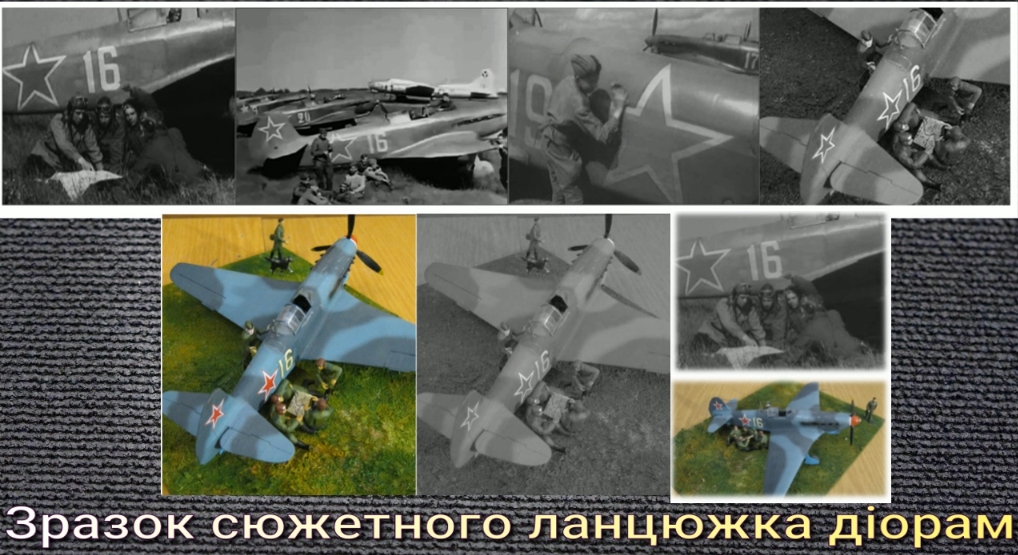 Для прикладу розглянемо головні етапи створення історико-технічної мінідіорами для музейної експозиції. Візьмемо уже згадану діораму про технічне обслуговування винищувача Р-40 (додаток 9),що має назву «Авіамеханіки». В основі—архівне фото Метельського Ф. .П..,що в додатку 7. Виходячи із фото—уточнюємо список необхідних стендових наборів, та матеріалів для створення виробу.