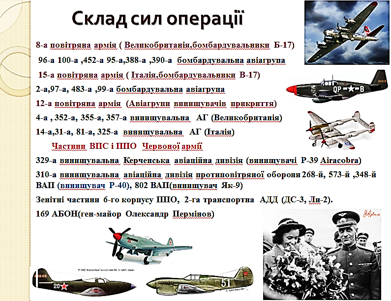 В ході операції «Френтік» для човникових рейдів нашими союзниками застосовувались лише бомбардувальники В-17, винищувачі супроводу Р-51 і важкі винищувачі Р-38, та військово-транспортні С-47. Вся інформація про склад сил ВПС США і СРСР подана на схемі додатку 6. Тому досить екзотично виглядають фото з бомбардувальником В-24 «Ліберейтор». Звідки він міг взятись то на засніжених просторах України, то в Криму, а то і на аеродромі в Полтаві? (див додаток 5 верхній ряд архівних фото).